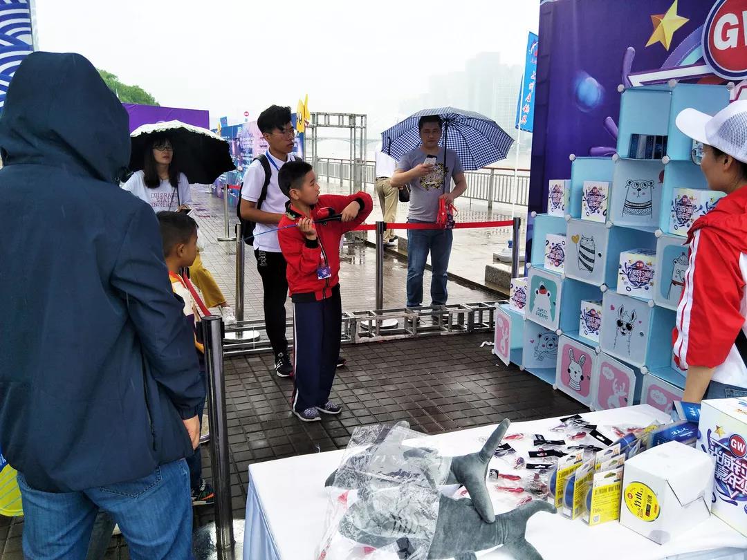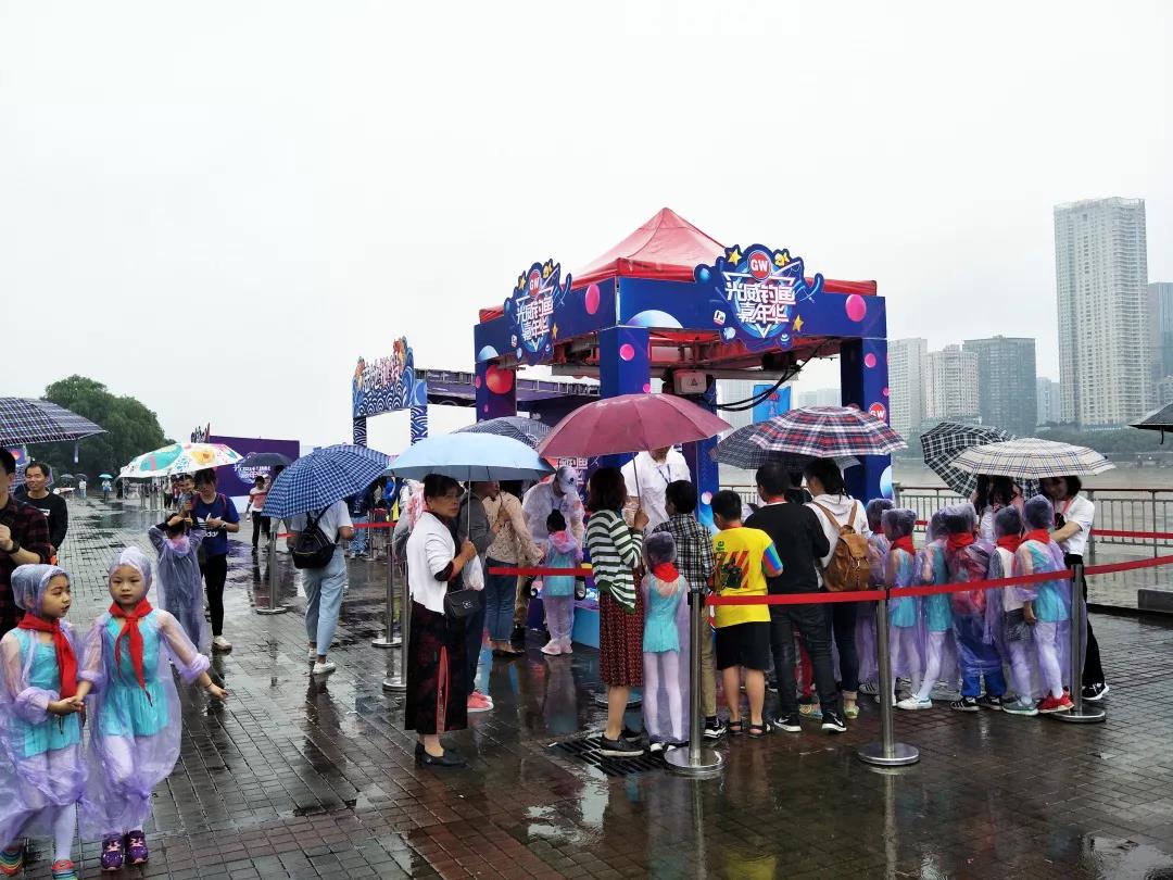 爸爸媽媽和小朋友們穿著雨衣、打著傘,不懼大雨滂沱,眼里只有歡喜和期待。甚至有人在項目前早早的排起了長隊,只為一馬當先,占得先機。