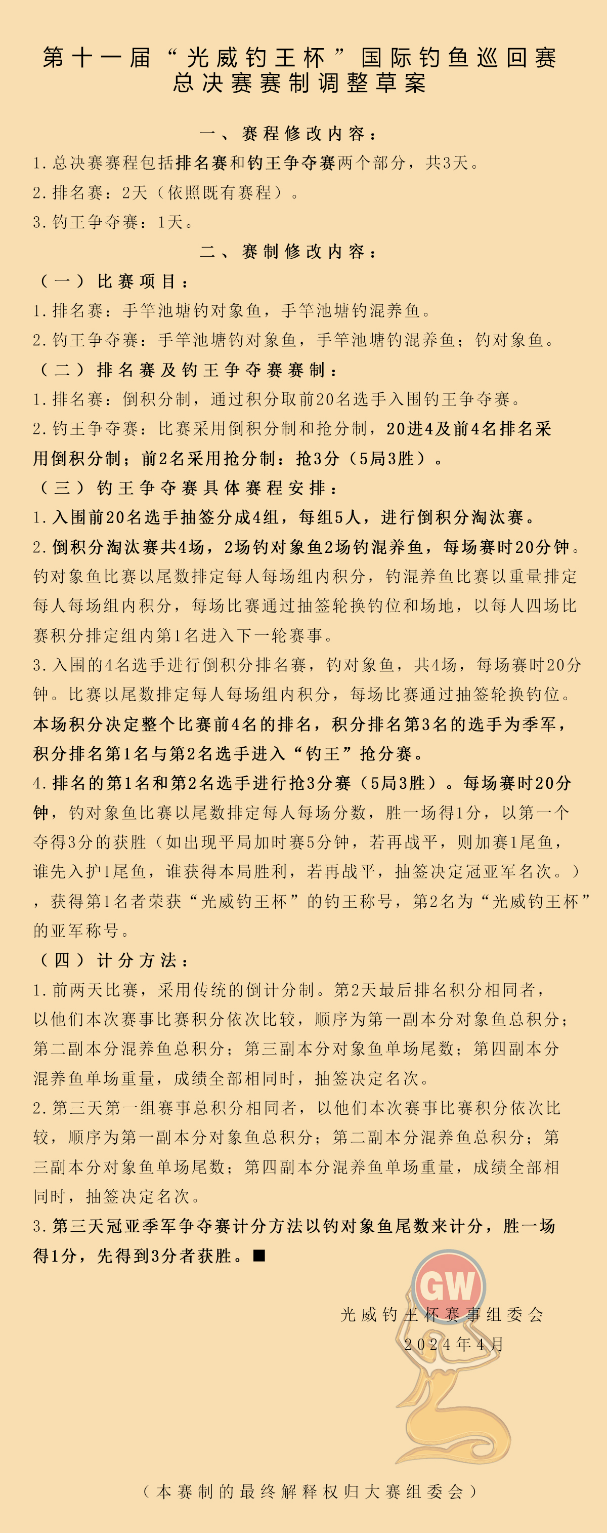第十一屆“光威釣王杯”國際釣魚巡回賽總決賽賽制調(diào)整草案